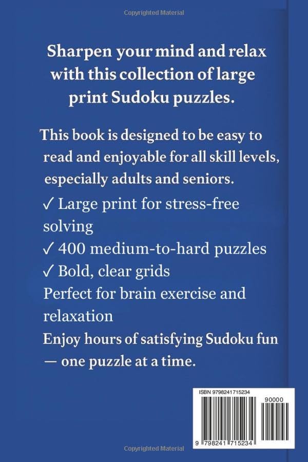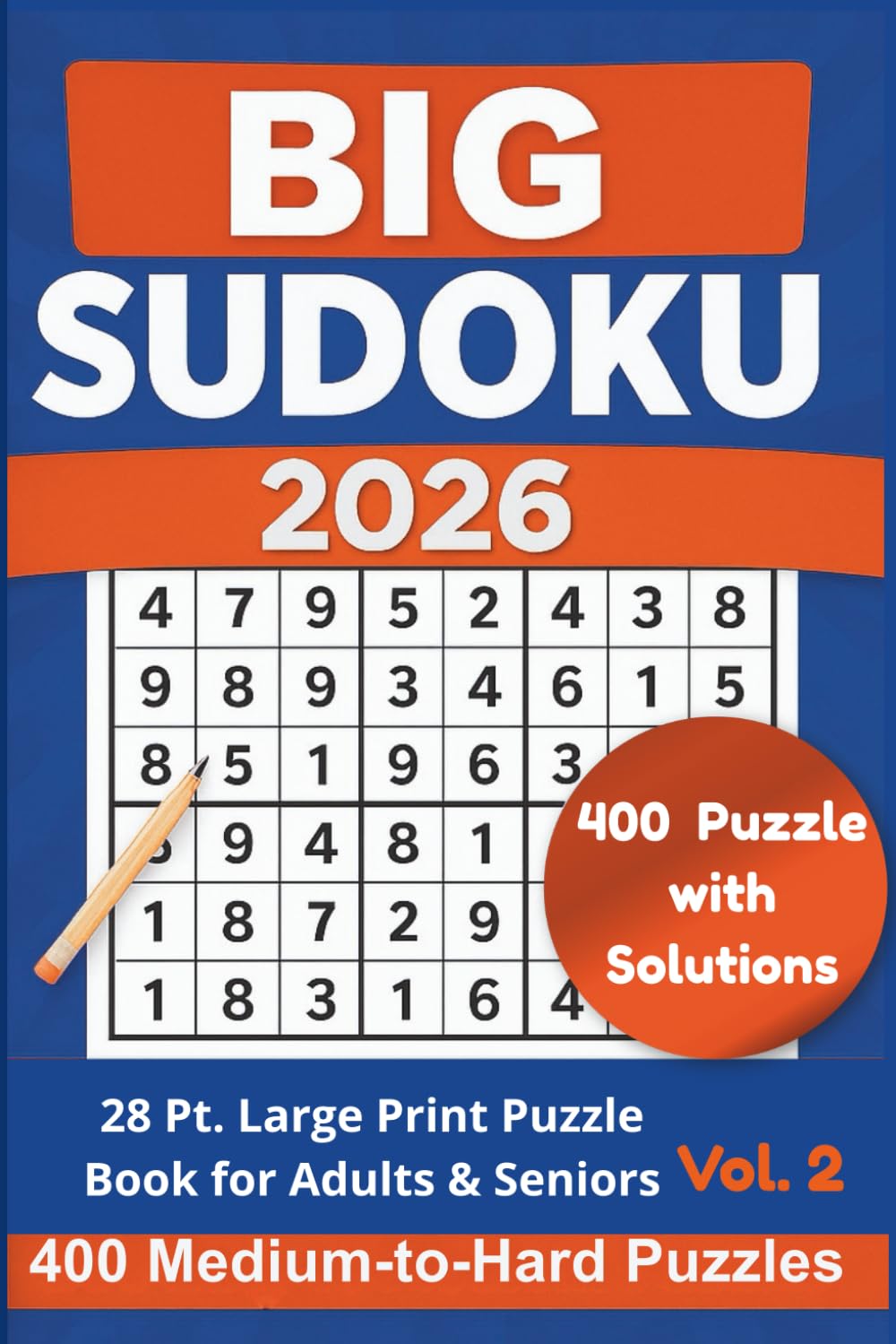 Sharpen your mind and relax with Big Sudoku 2026 – Volume 2, a large print Sudoku puzzle book designed for adults and seniors who enjoy a satisfying mental challenge without eye strain. This volume features 400 medium-to-hard Sudoku puzzles, carefully designed with bold, clear grids and easy-to-read numbers to ensure a comfortable solving experience. Whether you’re continuing from Volume 1 or jumping straight in, this book offers hours of engaging brain exercise at a steady, rewarding difficulty level.