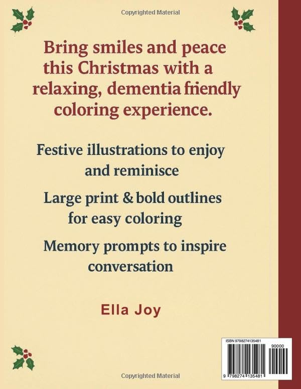 The Large Print Memory Boosting Christmas Coloring Book for Seniors by Ella Joy is a heartwarming, dementia-friendly collection of 50 simple and beautiful Christmas illustrations designed to calm the mind, spark memory, and fill each day with gentle happiness.
